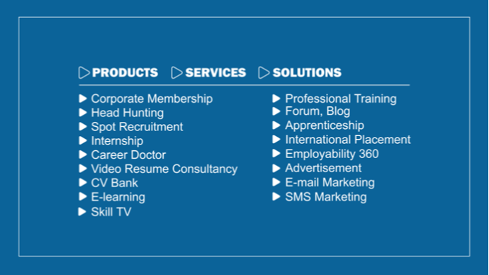 We name SkillJobs as a service provider that creates a bridge between skilled candidates and employers. Skill.jobs will keep track of trends and provide both hands-on training and online training to students, fresh graduates, and job seekers of all levels to make them ready for future jobs and professions. Skill.jobs will also provide necessary training to the employees of different organizations and corporate organizations.